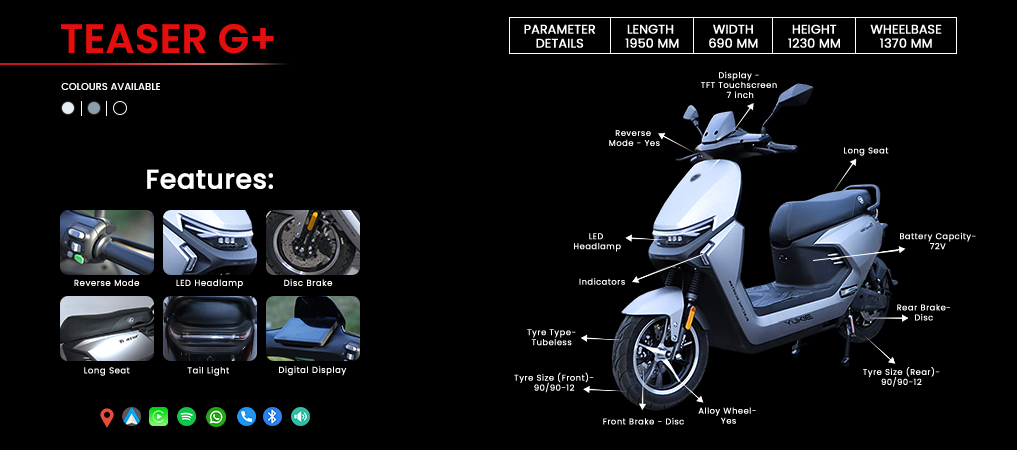 Meet the Yukie Teaser G+, the e-scooter that does more than just move you; it connects, comforts, and commands attention. With a 7-inch TFT touchscreen, Apple CarPlay, Android Auto, built-in speakers and navigation, it’s like your phone and your playlist got wheels. Twin disc brakes and telescopic suspension make every ride smooth and steady, even when the city isn’t. It charges in 8 to 10 hours, so you’re ready by morning. And yeah, it’s got reverse mode too, because sometimes life needs a little rewind.