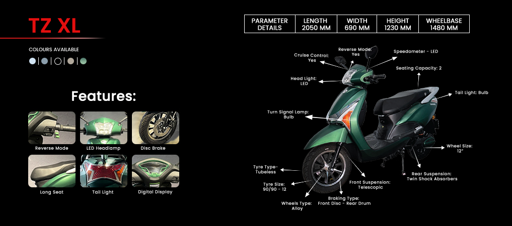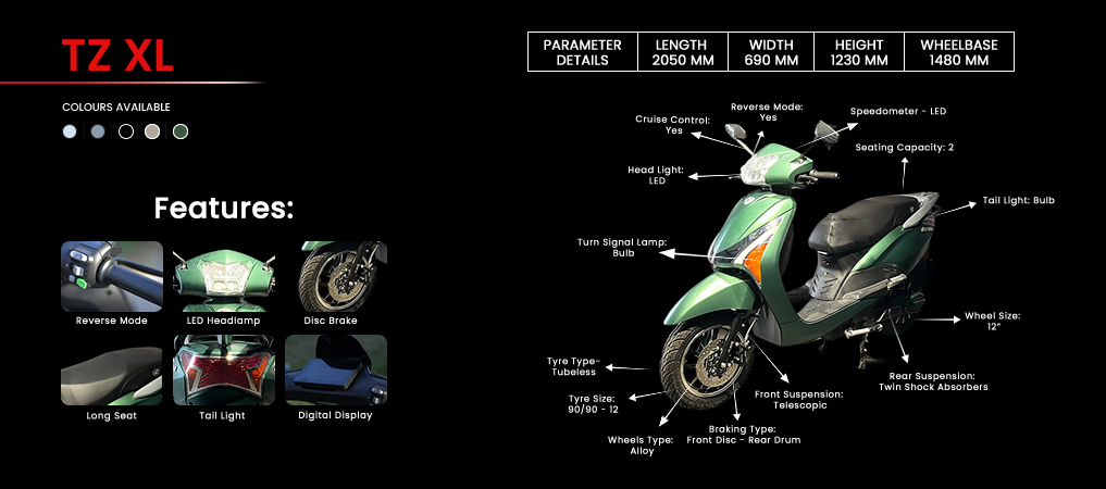 Whether you’re hauling cargo or just cruising in style, the TZ XL brings XL performance, XL comfort, and XL street cred, wrapped in head-turning shades like Military Green and Pearl Metallic White.